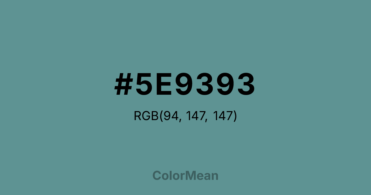 #5E9393 RGB value is (94, 147, 147). The hex color red value is 94, green is 147, and blue is 147. Its HSL format shows a hue of 180°, saturation of 22 percent, and lightness of 47 percent. The CMYK process values are 36 percent, 0 percent, 0 percent, 42 percent.