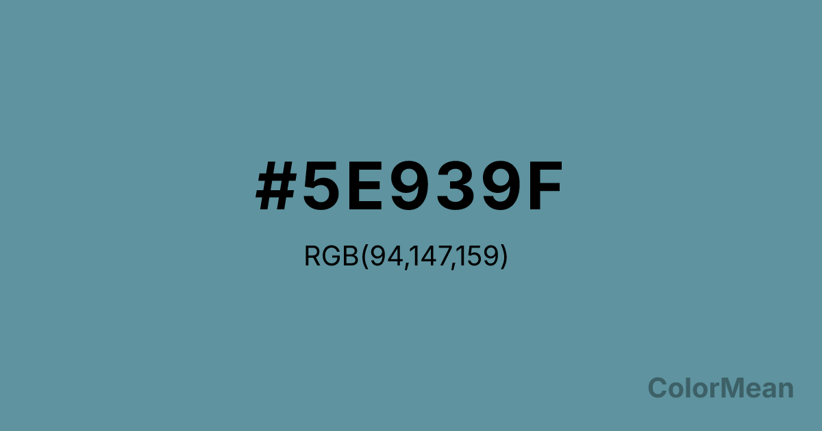 #5E939F RGB value is (94, 147, 159). The hex color red value is 94, green is 147, and blue is 159. Its HSL format shows a hue of 191°, saturation of 26 percent, and lightness of 50 percent. The CMYK process values are 41 percent, 8 percent, 0 percent, 38 percent.