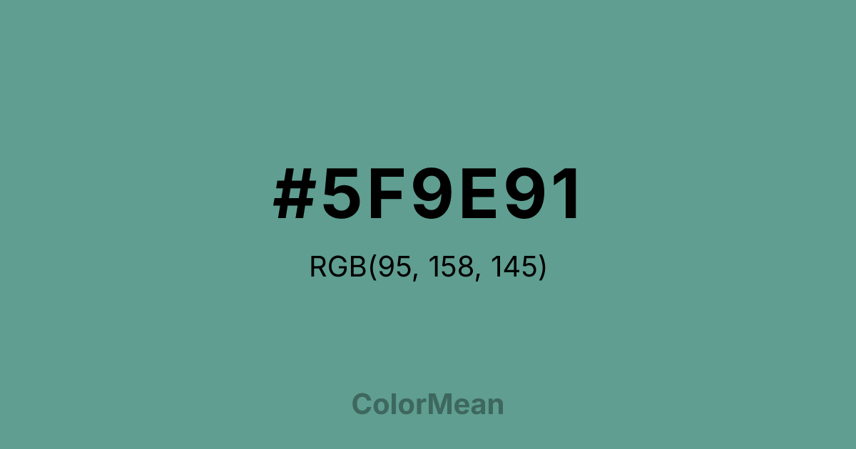 #5F9E91 RGB value is (95, 158, 145). The hex color red value is 95, green is 158, and blue is 145. Its HSL format shows a hue of 168°, saturation of 25 percent, and lightness of 50 percent. The CMYK process values are 40 percent, 0 percent, 8 percent, 38 percent.