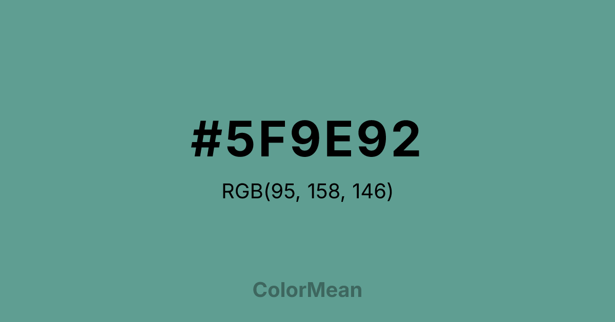 #5F9E92 RGB value is (95, 158, 146). The hex color red value is 95, green is 158, and blue is 146. Its HSL format shows a hue of 169°, saturation of 25 percent, and lightness of 50 percent. The CMYK process values are 40 percent, 0 percent, 8 percent, 38 percent.