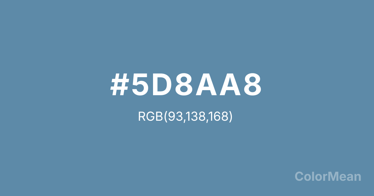Rackley (#5D8AA8) RGB value is (93, 138, 168). The hex color red value is 93, green is 138, and blue is 168. Its HSL format shows a hue of 204°, saturation of 30 percent, and lightness of 51 percent. The CMYK process values are 45 percent, 18 percent, 0 percent, 34 percent.