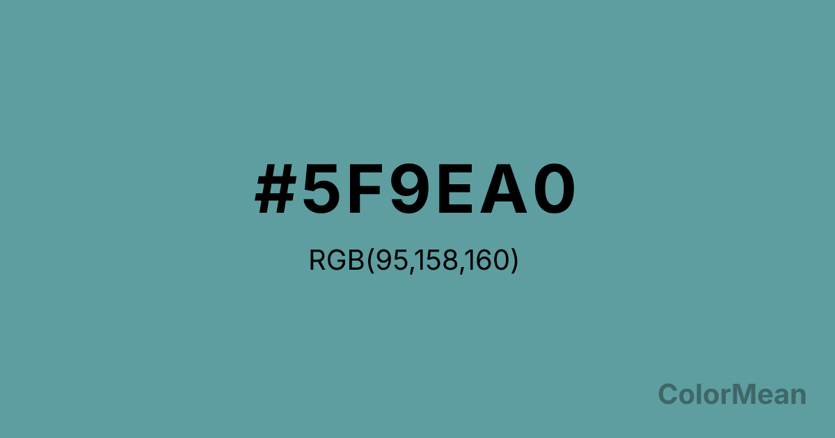 Cadet Blue (#5F9EA0) RGB value is (95, 158, 160). The hex color red value is 95, green is 158, and blue is 160. Its HSL format shows a hue of 182°, saturation of 25 percent, and lightness of 50 percent. The CMYK process values are 41 percent, 1 percent, 0 percent, 37 percent.