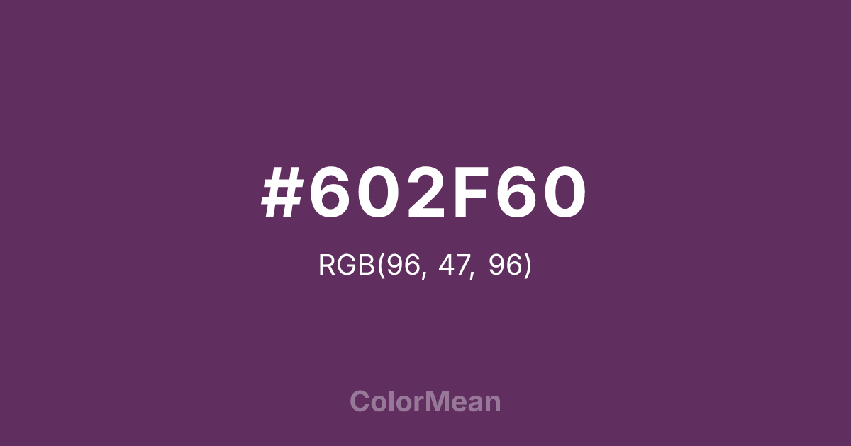 #602F60 RGB value is (96, 47, 96). The hex color red value is 96, green is 47, and blue is 96. Its HSL format shows a hue of 300°, saturation of 34 percent, and lightness of 28 percent. The CMYK process values are 0 percent, 51 percent, 0 percent, 62 percent.