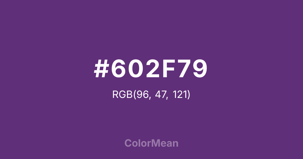 #602F79 RGB value is (96, 47, 121). The hex color red value is 96, green is 47, and blue is 121. Its HSL format shows a hue of 280°, saturation of 44 percent, and lightness of 33 percent. The CMYK process values are 21 percent, 61 percent, 0 percent, 53 percent.