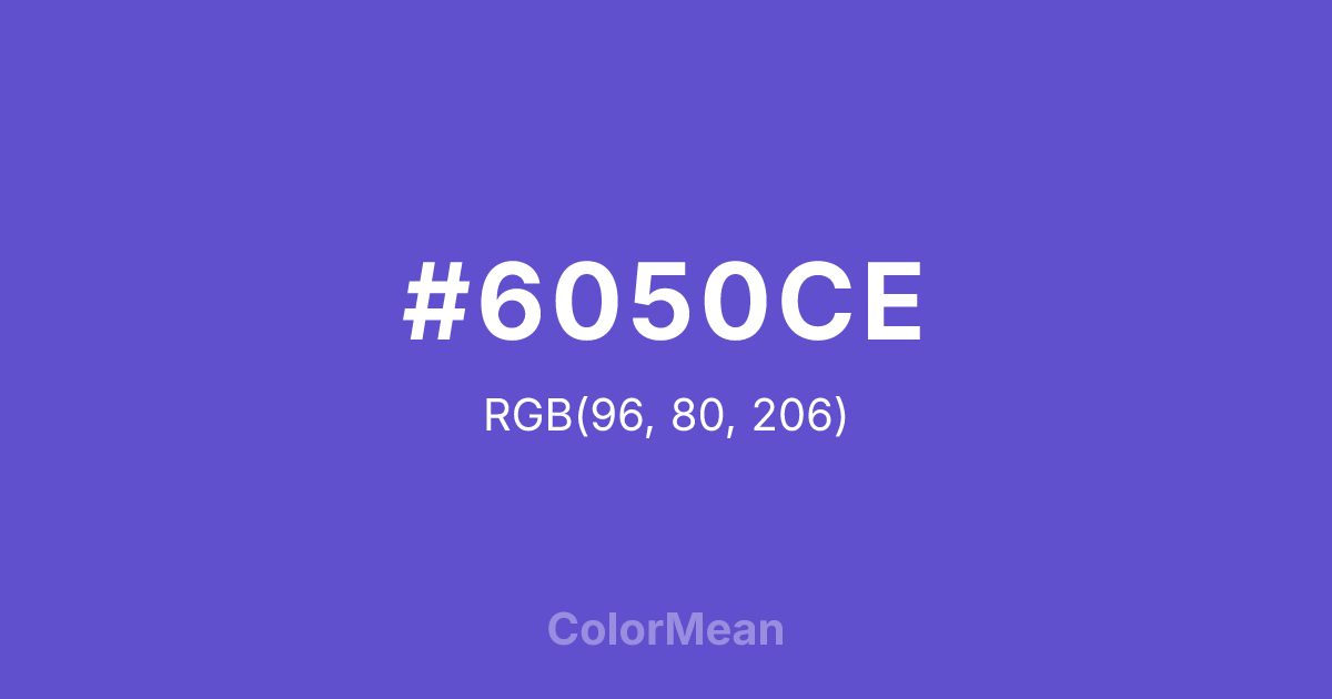 #6050CE RGB value is (96, 80, 206). The hex color red value is 96, green is 80, and blue is 206. Its HSL format shows a hue of 248°, saturation of 56 percent, and lightness of 56 percent. The CMYK process values are 53 percent, 61 percent, 0 percent, 19 percent.