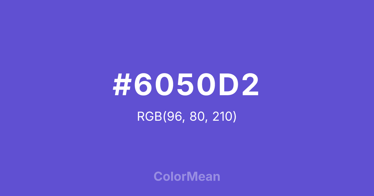 #6050D2 RGB value is (96, 80, 210). The hex color red value is 96, green is 80, and blue is 210. Its HSL format shows a hue of 247°, saturation of 59 percent, and lightness of 57 percent. The CMYK process values are 54 percent, 62 percent, 0 percent, 18 percent.