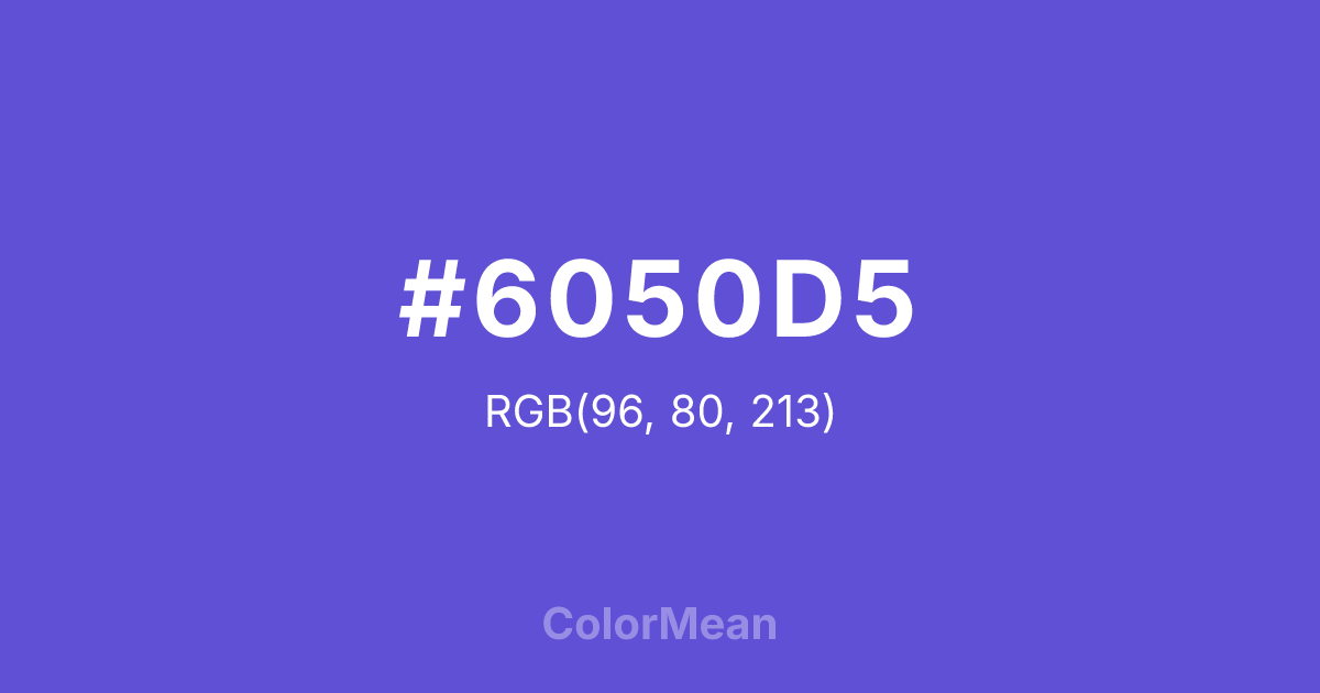 #6050D5 RGB value is (96, 80, 213). The hex color red value is 96, green is 80, and blue is 213. Its HSL format shows a hue of 247°, saturation of 61 percent, and lightness of 57 percent. The CMYK process values are 55 percent, 62 percent, 0 percent, 16 percent.