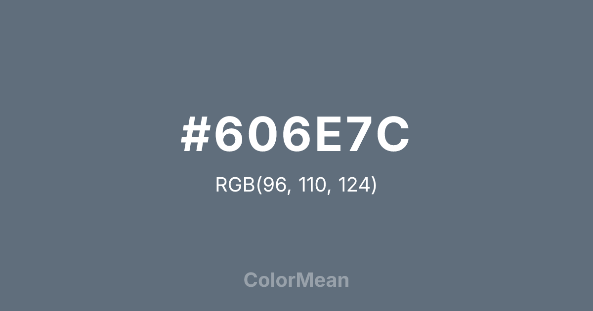 #606E7C RGB value is (96, 110, 124). The hex color red value is 96, green is 110, and blue is 124. Its HSL format shows a hue of 210°, saturation of 13 percent, and lightness of 43 percent. The CMYK process values are 23 percent, 11 percent, 0 percent, 51 percent.