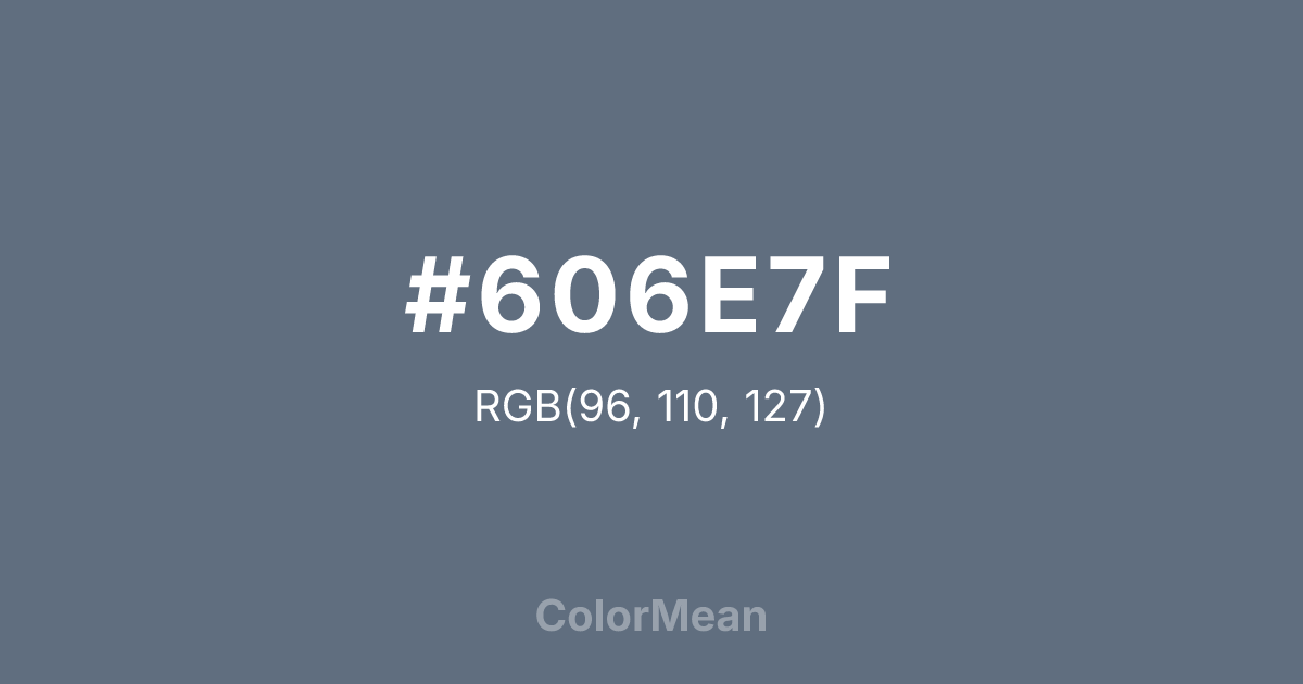 #606E7F RGB value is (96, 110, 127). The hex color red value is 96, green is 110, and blue is 127. Its HSL format shows a hue of 213°, saturation of 14 percent, and lightness of 44 percent. The CMYK process values are 24 percent, 13 percent, 0 percent, 50 percent.