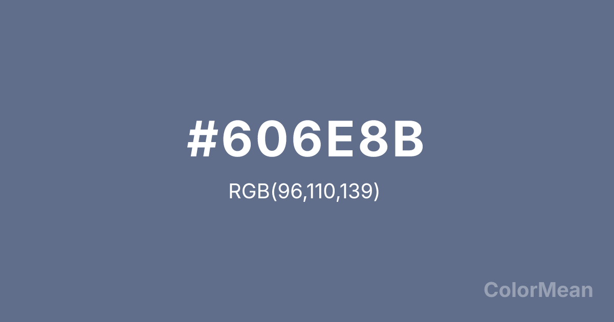 #606E8B RGB value is (96, 110, 139). The hex color red value is 96, green is 110, and blue is 139. Its HSL format shows a hue of 220°, saturation of 18 percent, and lightness of 46 percent. The CMYK process values are 31 percent, 21 percent, 0 percent, 45 percent.