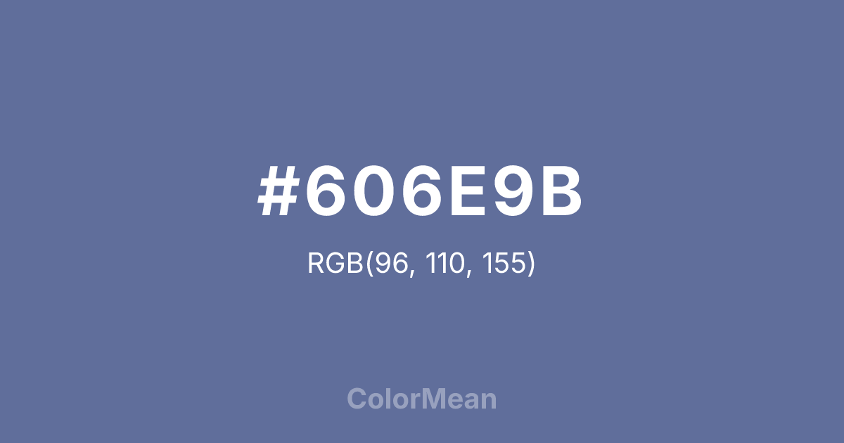 #606E9B RGB value is (96, 110, 155). The hex color red value is 96, green is 110, and blue is 155. Its HSL format shows a hue of 226°, saturation of 24 percent, and lightness of 49 percent. The CMYK process values are 38 percent, 29 percent, 0 percent, 39 percent.