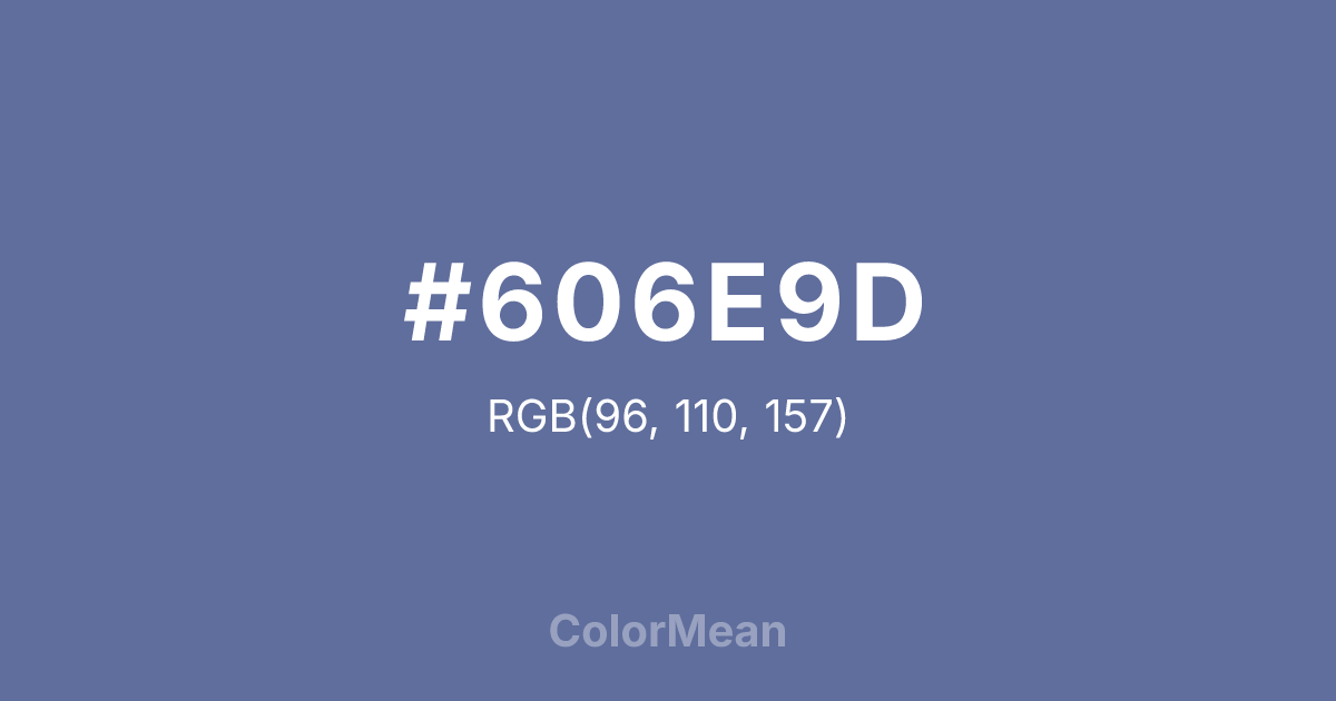 #606E9D RGB value is (96, 110, 157). The hex color red value is 96, green is 110, and blue is 157. Its HSL format shows a hue of 226°, saturation of 24 percent, and lightness of 50 percent. The CMYK process values are 39 percent, 30 percent, 0 percent, 38 percent.