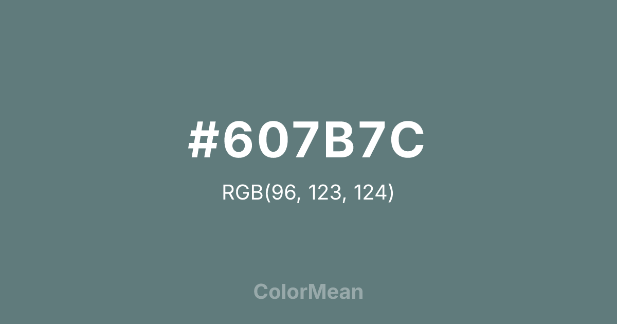 #607B7C RGB value is (96, 123, 124). The hex color red value is 96, green is 123, and blue is 124. Its HSL format shows a hue of 182°, saturation of 13 percent, and lightness of 43 percent. The CMYK process values are 23 percent, 1 percent, 0 percent, 51 percent.