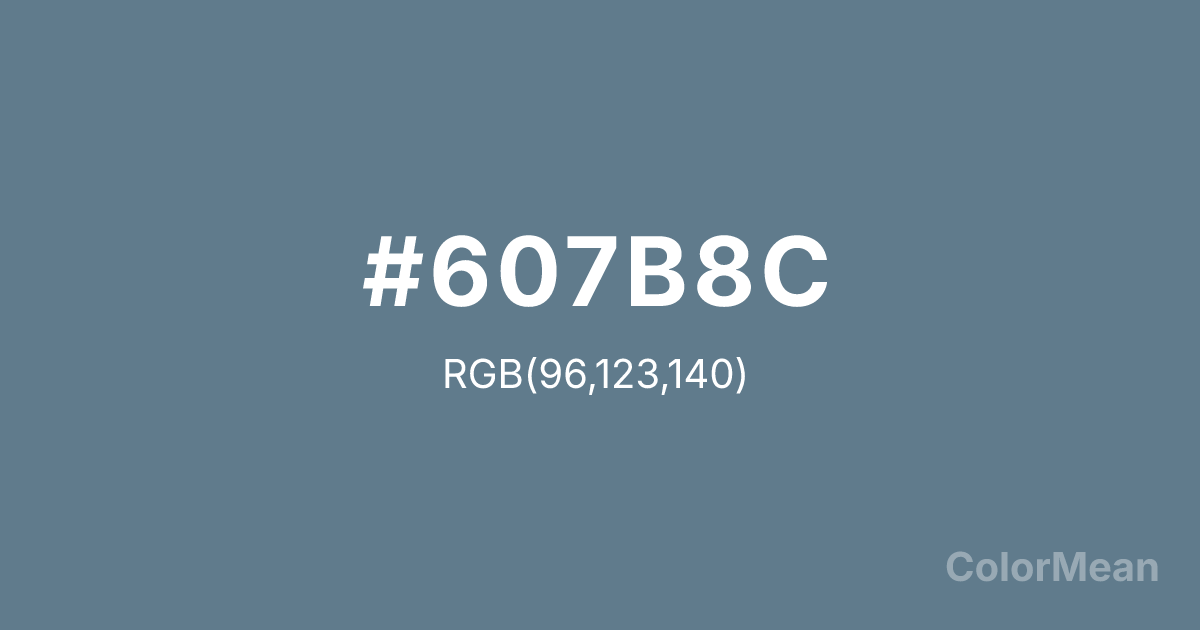 #607B8C RGB value is (96, 123, 140). The hex color red value is 96, green is 123, and blue is 140. Its HSL format shows a hue of 203°, saturation of 19 percent, and lightness of 46 percent. The CMYK process values are 31 percent, 12 percent, 0 percent, 45 percent.