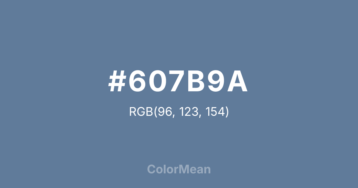 #607B9A RGB value is (96, 123, 154). The hex color red value is 96, green is 123, and blue is 154. Its HSL format shows a hue of 212°, saturation of 23 percent, and lightness of 49 percent. The CMYK process values are 38 percent, 20 percent, 0 percent, 40 percent.