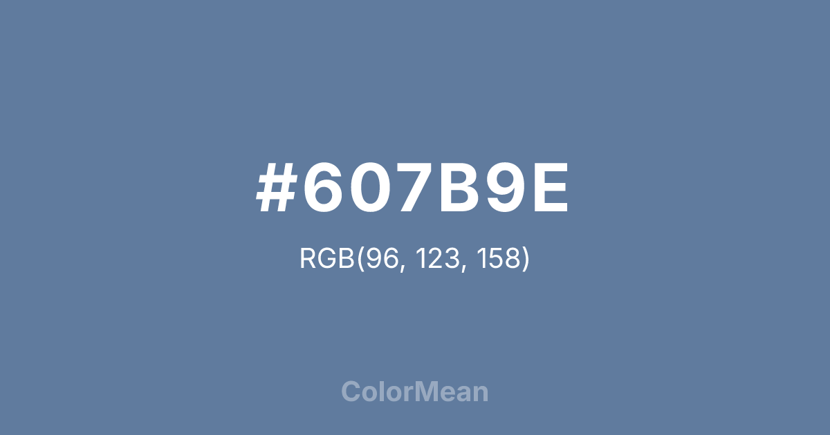 #607B9E RGB value is (96, 123, 158). The hex color red value is 96, green is 123, and blue is 158. Its HSL format shows a hue of 214°, saturation of 24 percent, and lightness of 50 percent. The CMYK process values are 39 percent, 22 percent, 0 percent, 38 percent.