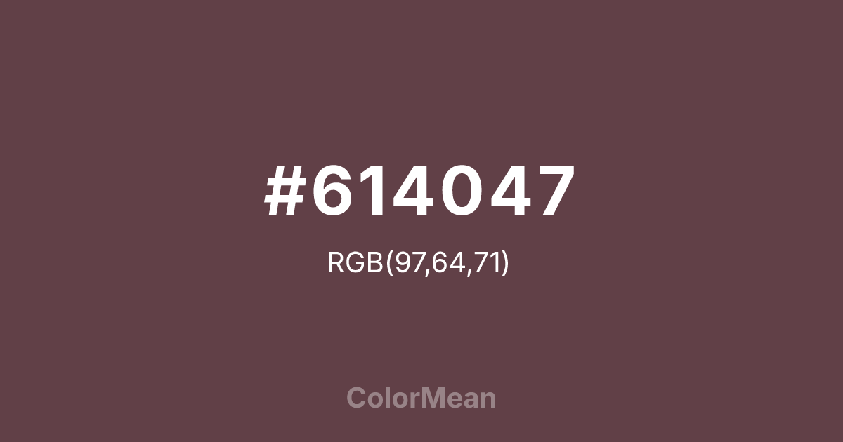 #614047 RGB value is (97, 64, 71). The hex color red value is 97, green is 64, and blue is 71. Its HSL format shows a hue of 347°, saturation of 20 percent, and lightness of 32 percent. The CMYK process values are 0 percent, 34 percent, 27 percent, 62 percent.