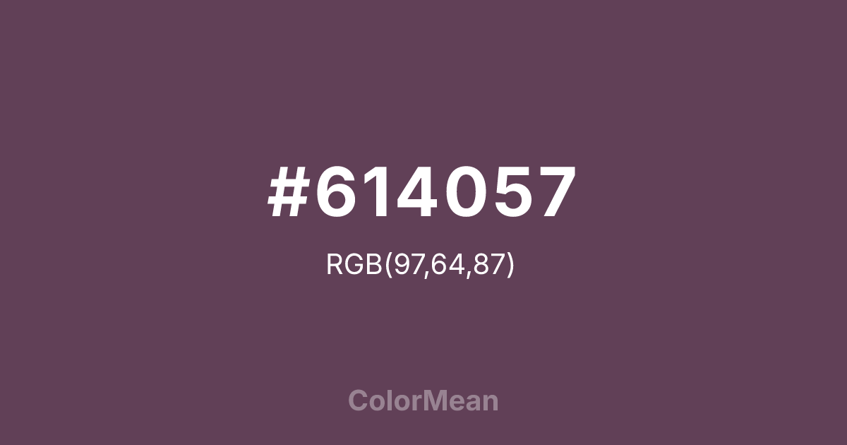 #614057 RGB value is (97, 64, 87). The hex color red value is 97, green is 64, and blue is 87. Its HSL format shows a hue of 318°, saturation of 20 percent, and lightness of 32 percent. The CMYK process values are 0 percent, 34 percent, 10 percent, 62 percent.