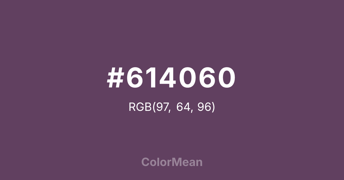 #614060 RGB value is (97, 64, 96). The hex color red value is 97, green is 64, and blue is 96. Its HSL format shows a hue of 302°, saturation of 20 percent, and lightness of 32 percent. The CMYK process values are 0 percent, 34 percent, 1 percent, 62 percent.