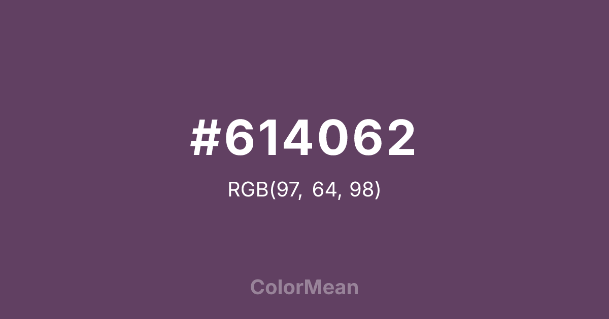 #614062 RGB value is (97, 64, 98). The hex color red value is 97, green is 64, and blue is 98. Its HSL format shows a hue of 298°, saturation of 21 percent, and lightness of 32 percent. The CMYK process values are 1 percent, 35 percent, 0 percent, 62 percent.