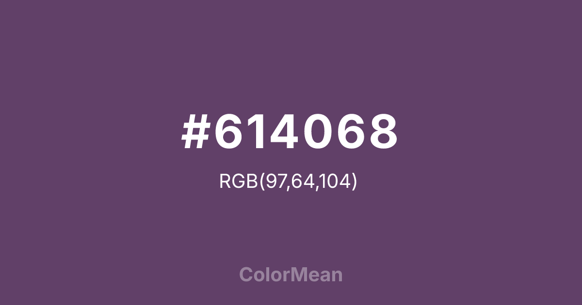 #614068 RGB value is (97, 64, 104). The hex color red value is 97, green is 64, and blue is 104. Its HSL format shows a hue of 290°, saturation of 24 percent, and lightness of 33 percent. The CMYK process values are 7 percent, 38 percent, 0 percent, 59 percent.