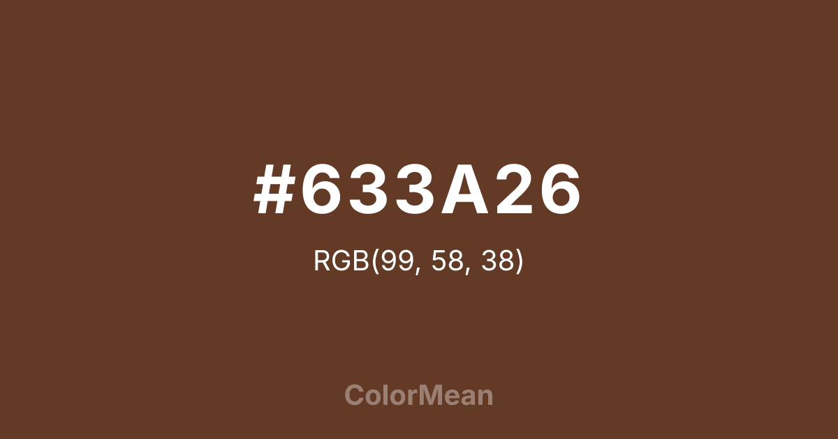 #633A26 RGB value is (99, 58, 38). The hex color red value is 99, green is 58, and blue is 38. Its HSL format shows a hue of 20°, saturation of 45 percent, and lightness of 27 percent. The CMYK process values are 0 percent, 41 percent, 62 percent, 61 percent.