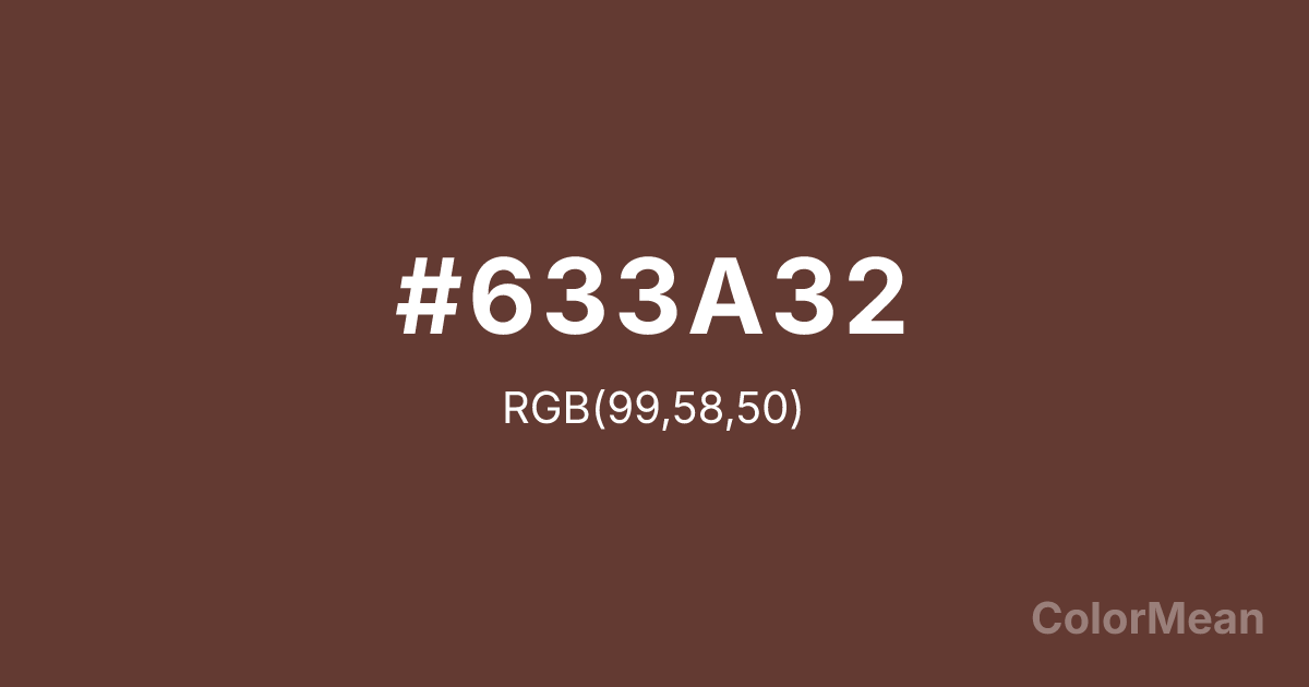 #633A32 RGB value is (99, 58, 50). The hex color red value is 99, green is 58, and blue is 50. Its HSL format shows a hue of 10°, saturation of 33 percent, and lightness of 29 percent. The CMYK process values are 0 percent, 41 percent, 49 percent, 61 percent.