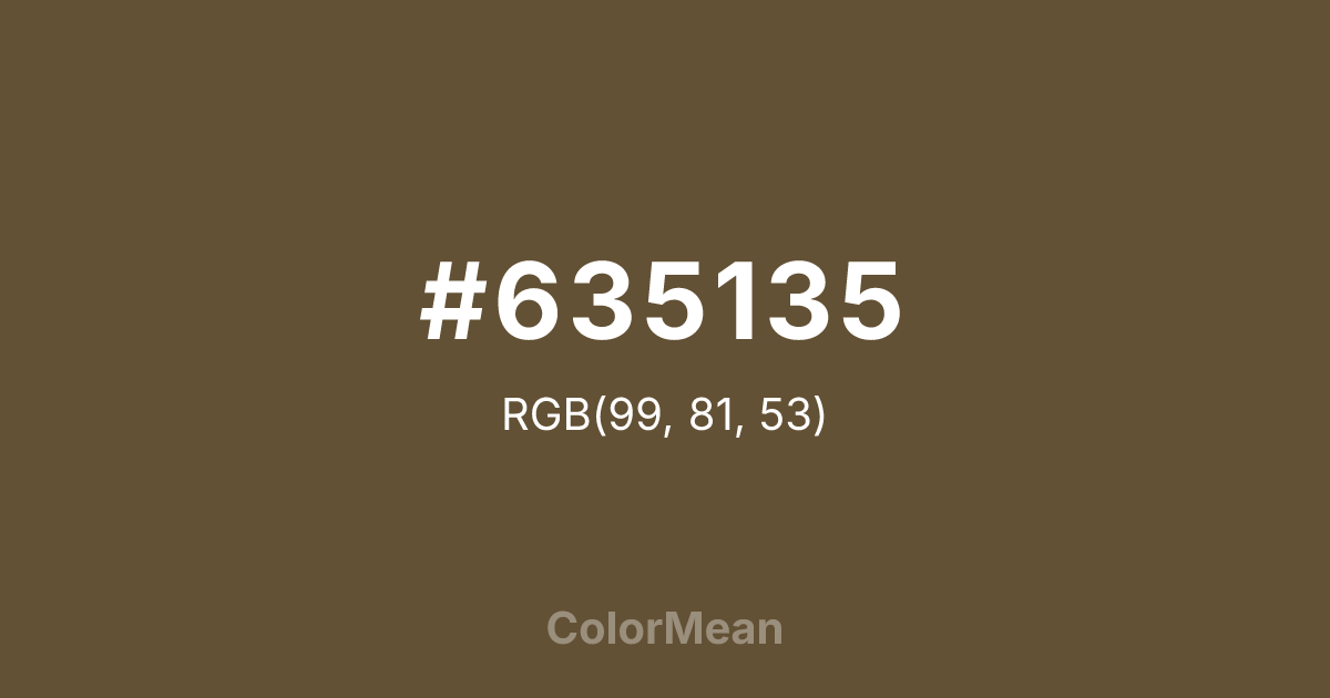 #635135 RGB value is (99, 81, 53). The hex color red value is 99, green is 81, and blue is 53. Its HSL format shows a hue of 37°, saturation of 30 percent, and lightness of 30 percent. The CMYK process values are 0 percent, 18 percent, 46 percent, 61 percent.