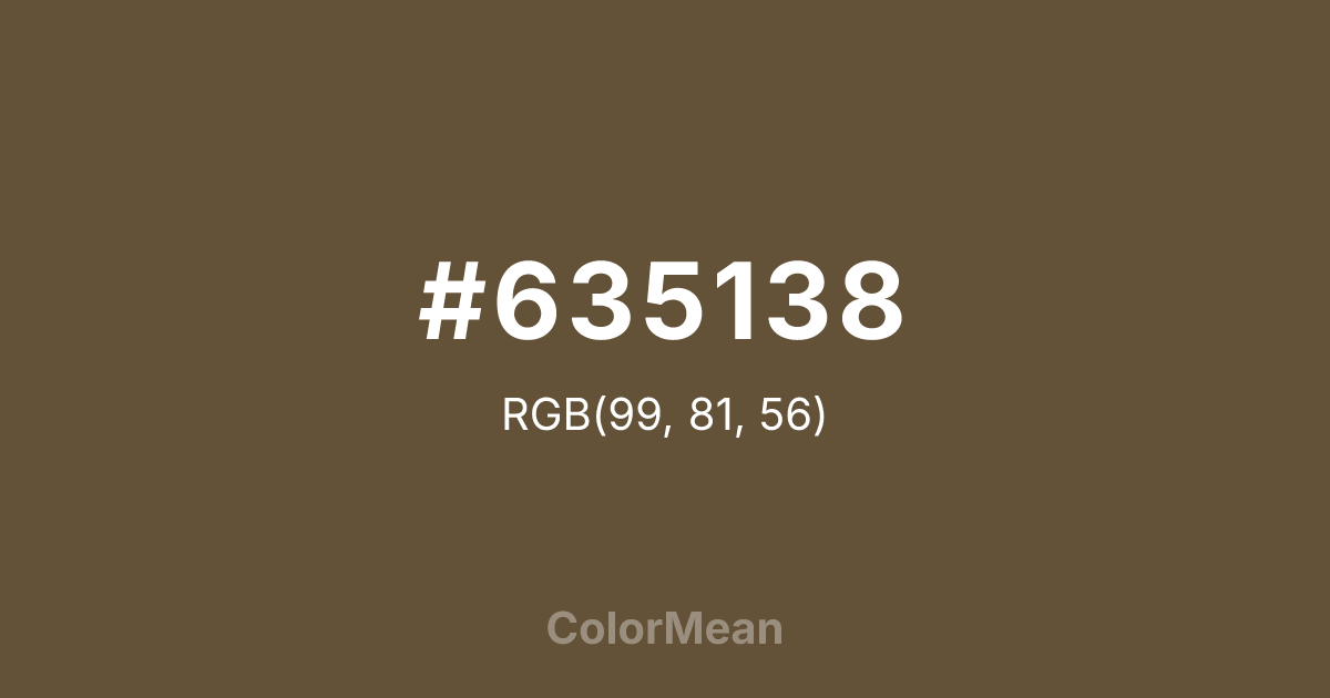 #635138 RGB value is (99, 81, 56). The hex color red value is 99, green is 81, and blue is 56. Its HSL format shows a hue of 35°, saturation of 28 percent, and lightness of 30 percent. The CMYK process values are 0 percent, 18 percent, 43 percent, 61 percent.