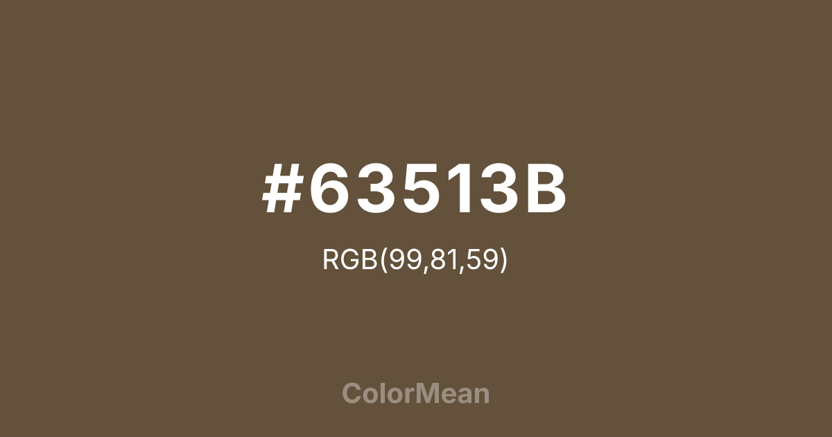 #63513B RGB value is (99, 81, 59). The hex color red value is 99, green is 81, and blue is 59. Its HSL format shows a hue of 33°, saturation of 25 percent, and lightness of 31 percent. The CMYK process values are 0 percent, 18 percent, 40 percent, 61 percent.