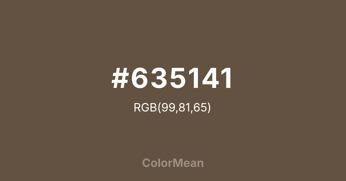#635141 RGB value is (99, 81, 65). The hex color red value is 99, green is 81, and blue is 65. Its HSL format shows a hue of 28°, saturation of 21 percent, and lightness of 32 percent. The CMYK process values are 0 percent, 18 percent, 34 percent, 61 percent.