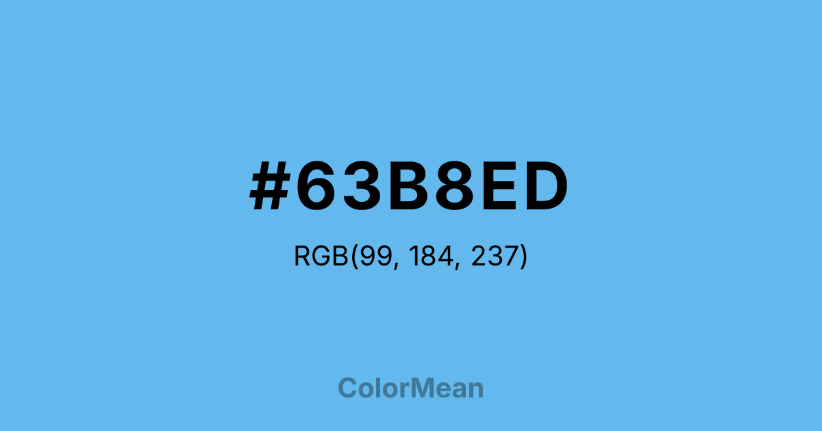 #63B8ED RGB value is (99, 184, 237). The hex color red value is 99, green is 184, and blue is 237. Its HSL format shows a hue of 203°, saturation of 79 percent, and lightness of 66 percent. The CMYK process values are 58 percent, 22 percent, 0 percent, 7 percent.