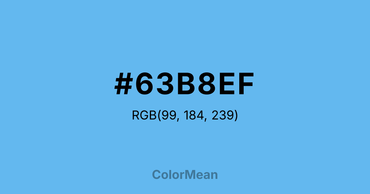 #63B8EF RGB value is (99, 184, 239). The hex color red value is 99, green is 184, and blue is 239. Its HSL format shows a hue of 204°, saturation of 81 percent, and lightness of 66 percent. The CMYK process values are 59 percent, 23 percent, 0 percent, 6 percent.