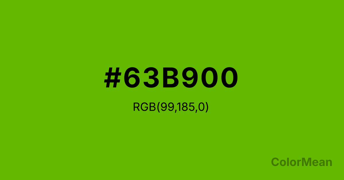 #63B900 RGB value is (99, 185, 0). The hex color red value is 99, green is 185, and blue is 0. Its HSL format shows a hue of 88°, saturation of 100 percent, and lightness of 36 percent. The CMYK process values are 46 percent, 0 percent, 100 percent, 27 percent.