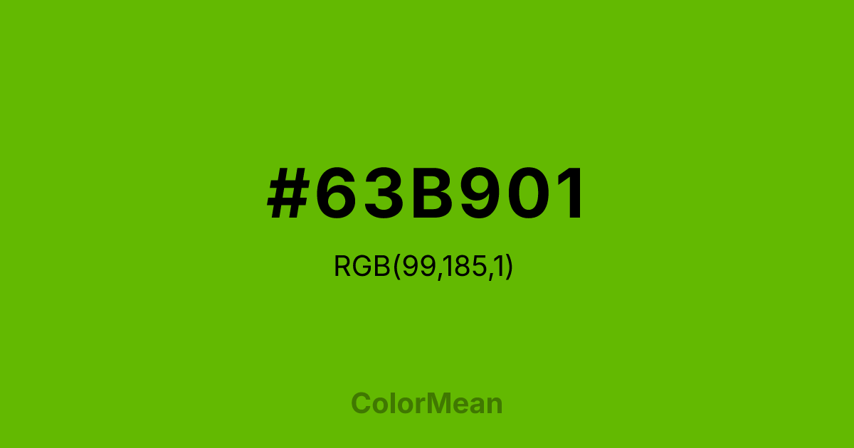 #63B901 RGB value is (99, 185, 1). The hex color red value is 99, green is 185, and blue is 1. Its HSL format shows a hue of 88°, saturation of 99 percent, and lightness of 36 percent. The CMYK process values are 46 percent, 0 percent, 99 percent, 27 percent.