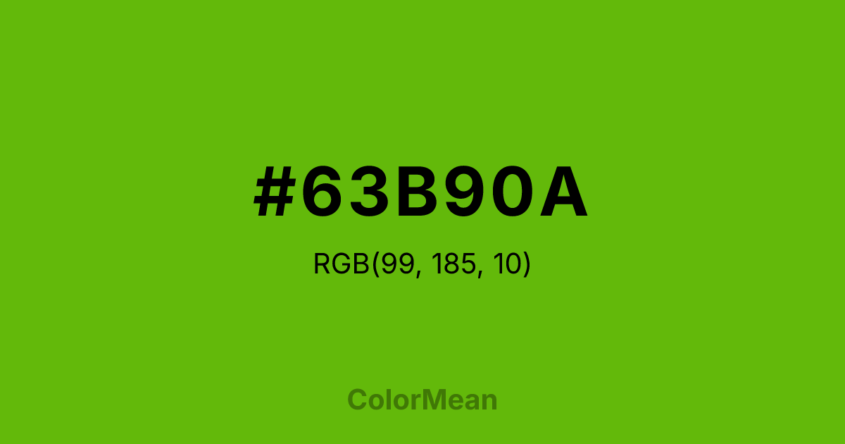 #63B90A RGB value is (99, 185, 10). The hex color red value is 99, green is 185, and blue is 10. Its HSL format shows a hue of 89°, saturation of 90 percent, and lightness of 38 percent. The CMYK process values are 46 percent, 0 percent, 95 percent, 27 percent.