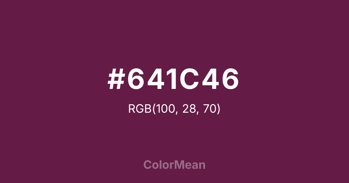 #641C46 RGB value is (100, 28, 70). The hex color red value is 100, green is 28, and blue is 70. Its HSL format shows a hue of 325°, saturation of 56 percent, and lightness of 25 percent. The CMYK process values are 0 percent, 72 percent, 30 percent, 61 percent.