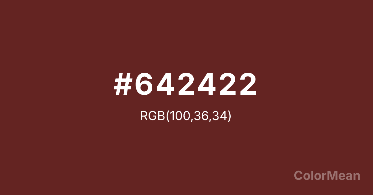 #642422 RGB value is (100, 36, 34). The hex color red value is 100, green is 36, and blue is 34. Its HSL format shows a hue of 2°, saturation of 49 percent, and lightness of 26 percent. The CMYK process values are 0 percent, 64 percent, 66 percent, 61 percent.