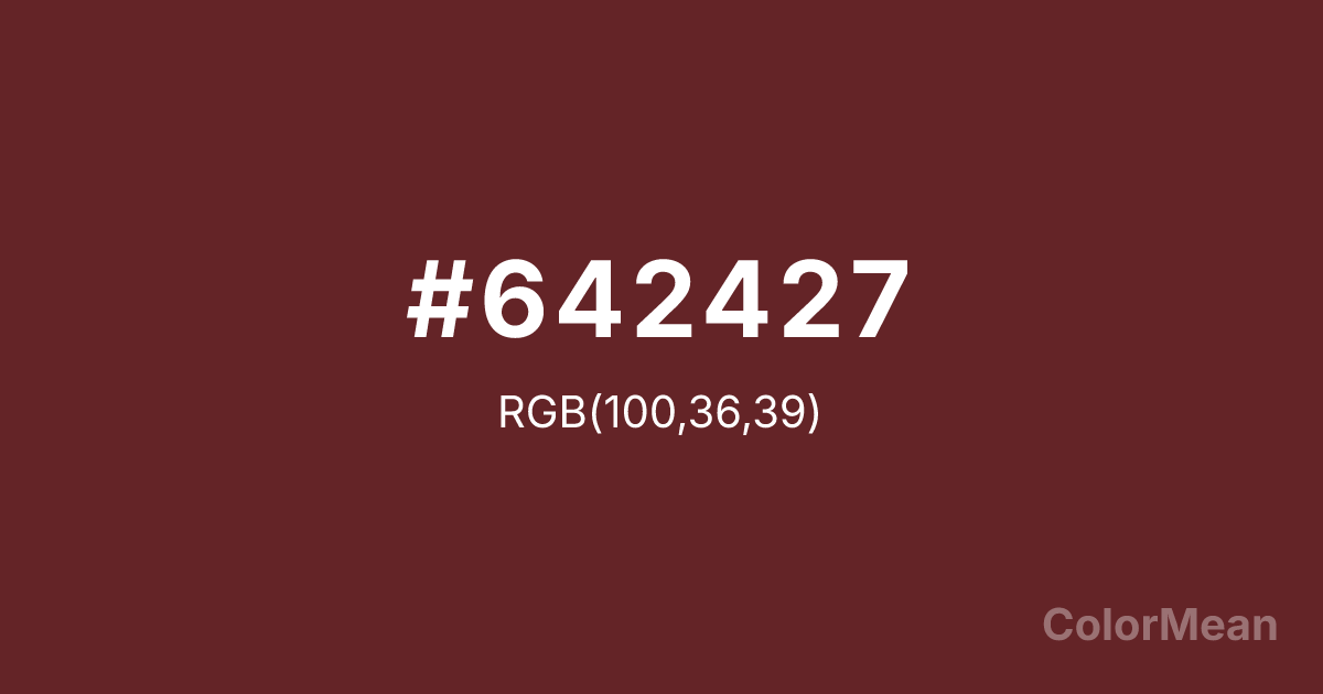 #642427 RGB value is (100, 36, 39). The hex color red value is 100, green is 36, and blue is 39. Its HSL format shows a hue of 357°, saturation of 47 percent, and lightness of 27 percent. The CMYK process values are 0 percent, 64 percent, 61 percent, 61 percent.