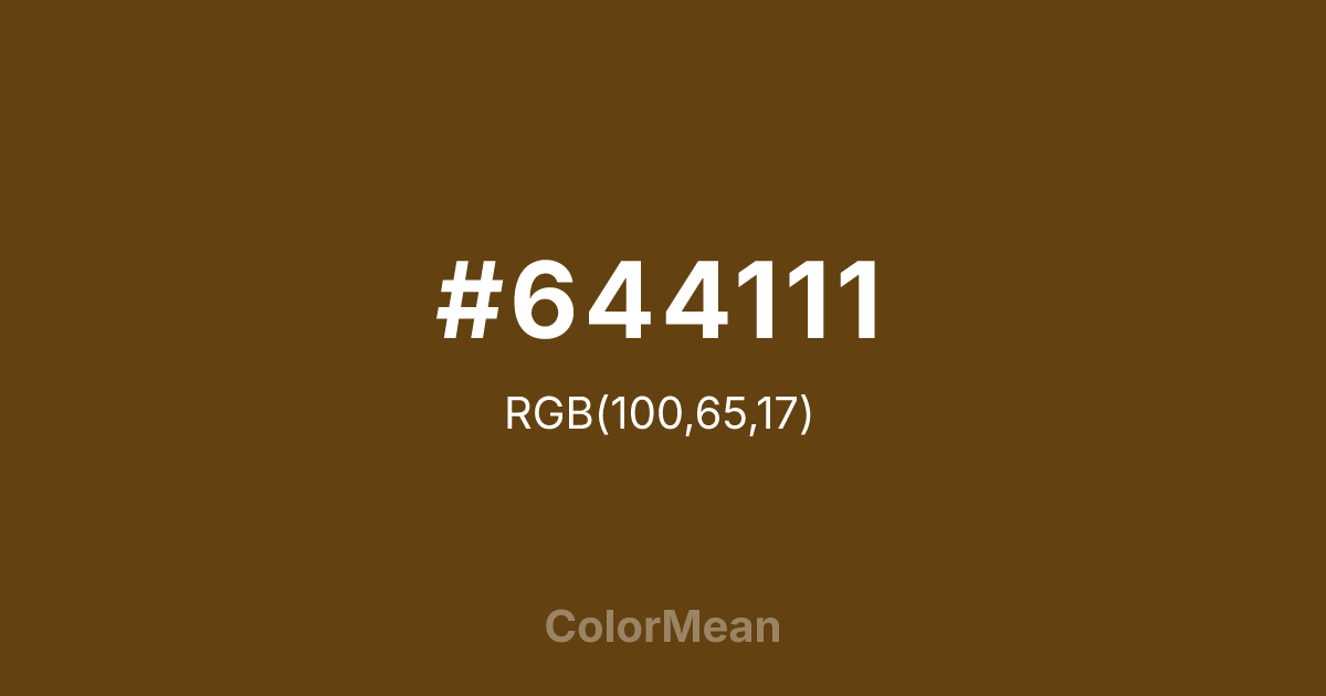 #644111 RGB value is (100, 65, 17). The hex color red value is 100, green is 65, and blue is 17. Its HSL format shows a hue of 35°, saturation of 71 percent, and lightness of 23 percent. The CMYK process values are 0 percent, 35 percent, 83 percent, 61 percent.