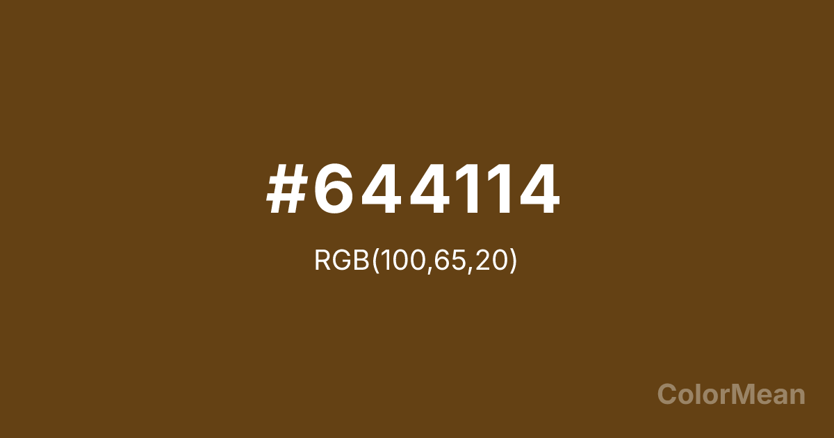 #644114 RGB value is (100, 65, 20). The hex color red value is 100, green is 65, and blue is 20. Its HSL format shows a hue of 34°, saturation of 67 percent, and lightness of 24 percent. The CMYK process values are 0 percent, 35 percent, 80 percent, 61 percent.