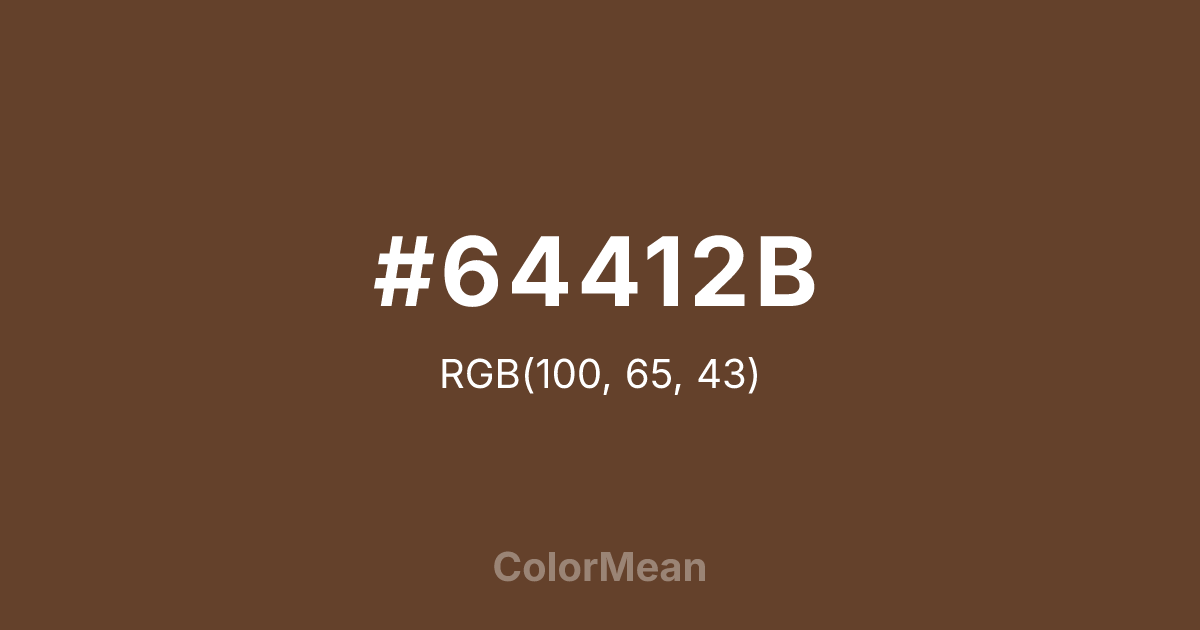#64412B RGB value is (100, 65, 43). The hex color red value is 100, green is 65, and blue is 43. Its HSL format shows a hue of 23°, saturation of 40 percent, and lightness of 28 percent. The CMYK process values are 0 percent, 35 percent, 57 percent, 61 percent.