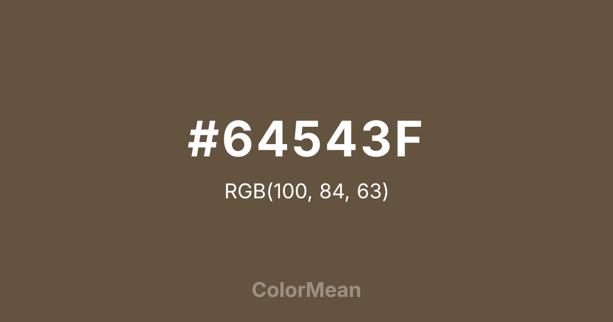#64543F RGB value is (100, 84, 63). The hex color red value is 100, green is 84, and blue is 63. Its HSL format shows a hue of 34°, saturation of 23 percent, and lightness of 32 percent. The CMYK process values are 0 percent, 16 percent, 37 percent, 61 percent.