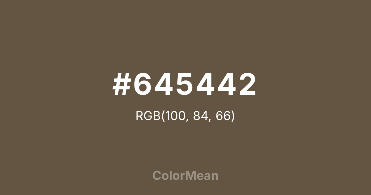 #645442 RGB value is (100, 84, 66). The hex color red value is 100, green is 84, and blue is 66. Its HSL format shows a hue of 32°, saturation of 20 percent, and lightness of 33 percent. The CMYK process values are 0 percent, 16 percent, 34 percent, 61 percent.