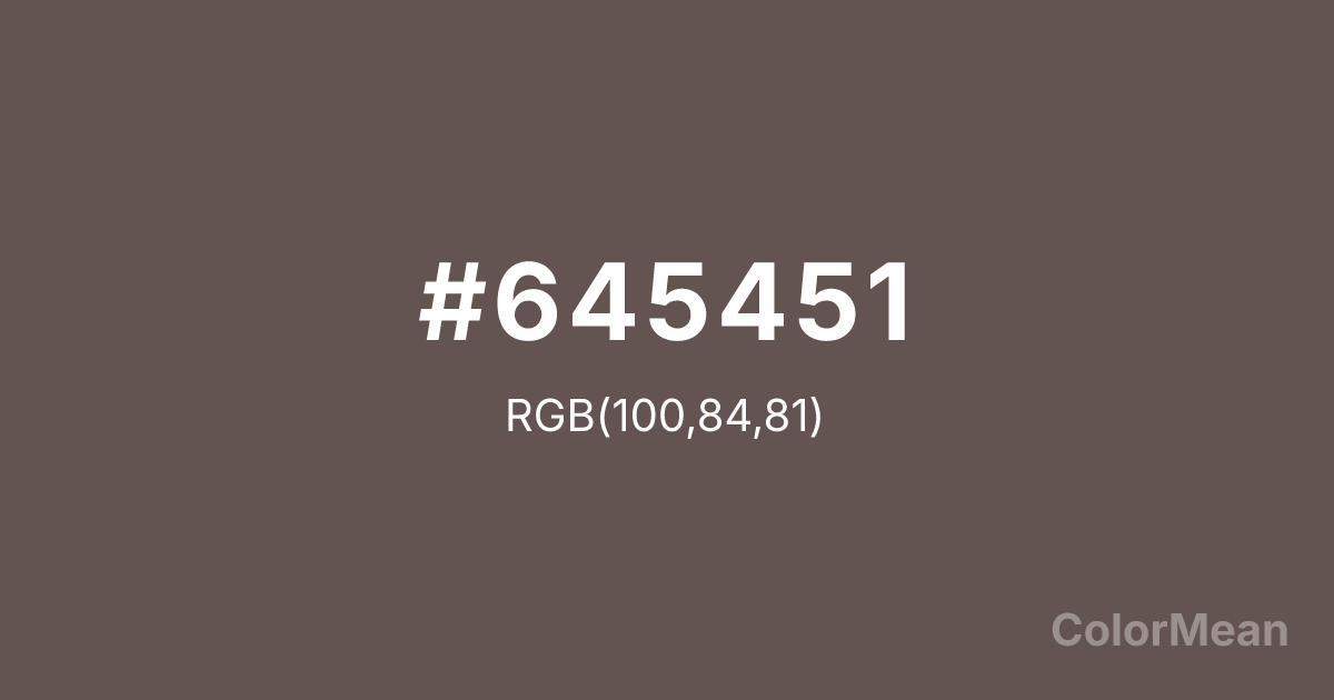#645451 RGB value is (100, 84, 81). The hex color red value is 100, green is 84, and blue is 81. Its HSL format shows a hue of 9°, saturation of 10 percent, and lightness of 35 percent. The CMYK process values are 0 percent, 16 percent, 19 percent, 61 percent.