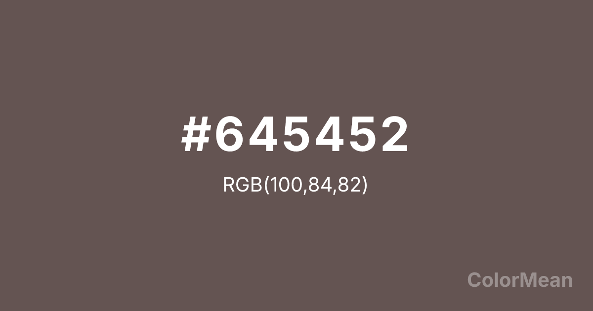 Wenge (#645452) RGB value is (100, 84, 82). The hex color red value is 100, green is 84, and blue is 82. Its HSL format shows a hue of 7°, saturation of 10 percent, and lightness of 36 percent. The CMYK process values are 0 percent, 16 percent, 18 percent, 61 percent.