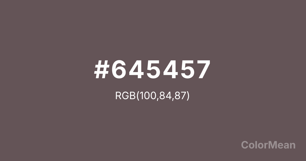 #645457 RGB value is (100, 84, 87). The hex color red value is 100, green is 84, and blue is 87. Its HSL format shows a hue of 349°, saturation of 9 percent, and lightness of 36 percent. The CMYK process values are 0 percent, 16 percent, 13 percent, 61 percent.