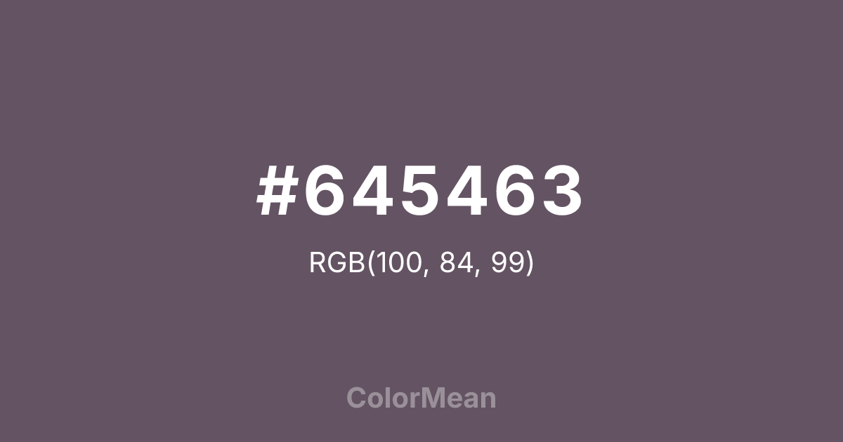 #645463 RGB value is (100, 84, 99). The hex color red value is 100, green is 84, and blue is 99. Its HSL format shows a hue of 304°, saturation of 9 percent, and lightness of 36 percent. The CMYK process values are 0 percent, 16 percent, 1 percent, 61 percent.