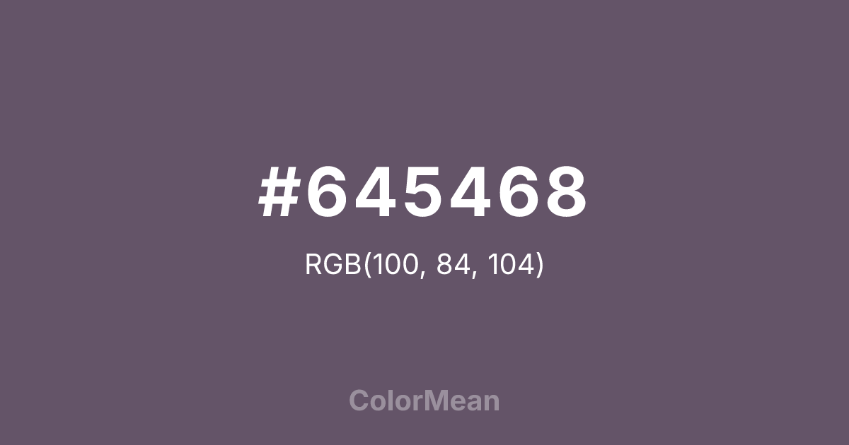 #645468 RGB value is (100, 84, 104). The hex color red value is 100, green is 84, and blue is 104. Its HSL format shows a hue of 288°, saturation of 11 percent, and lightness of 37 percent. The CMYK process values are 4 percent, 19 percent, 0 percent, 59 percent.