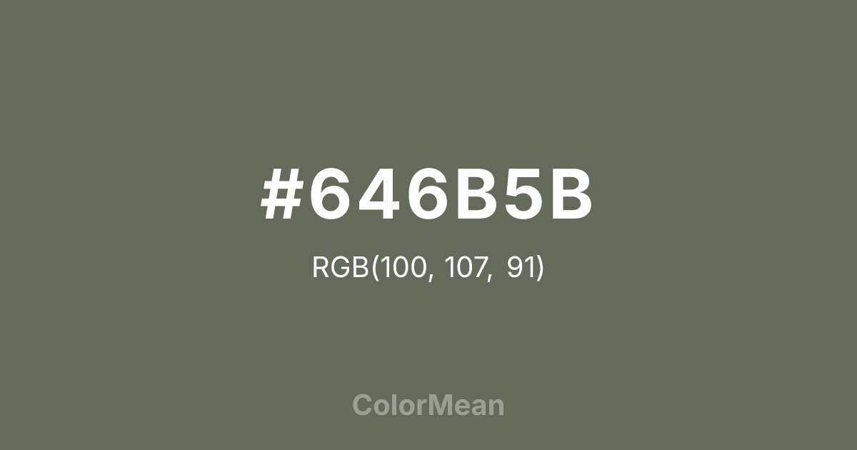#646B5B RGB value is (100, 107, 91). The hex color red value is 100, green is 107, and blue is 91. Its HSL format shows a hue of 86°, saturation of 8 percent, and lightness of 39 percent. The CMYK process values are 7 percent, 0 percent, 15 percent, 58 percent.